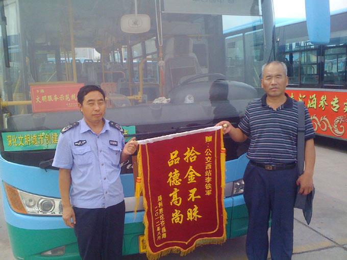 8月29日上午,墾利的許福海先生拿著一面寫有“拾金不昧 品德高尚”的錦旗來到汽車三隊,向9路駕駛員李鐵軍同志拾金不昧的高尚行為表示感謝。