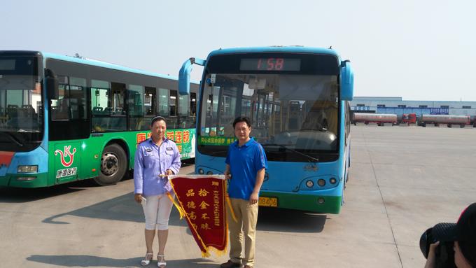 7月14日下午,乘客周磊先生拿著一面寫有“拾金不昧、品德高尚”的錦旗來到市公交公司汽車五隊(duì),特來對車隊(duì)駕駛員劉景妲師傅拾金不昧的行為表示感謝。