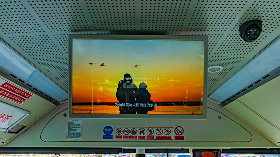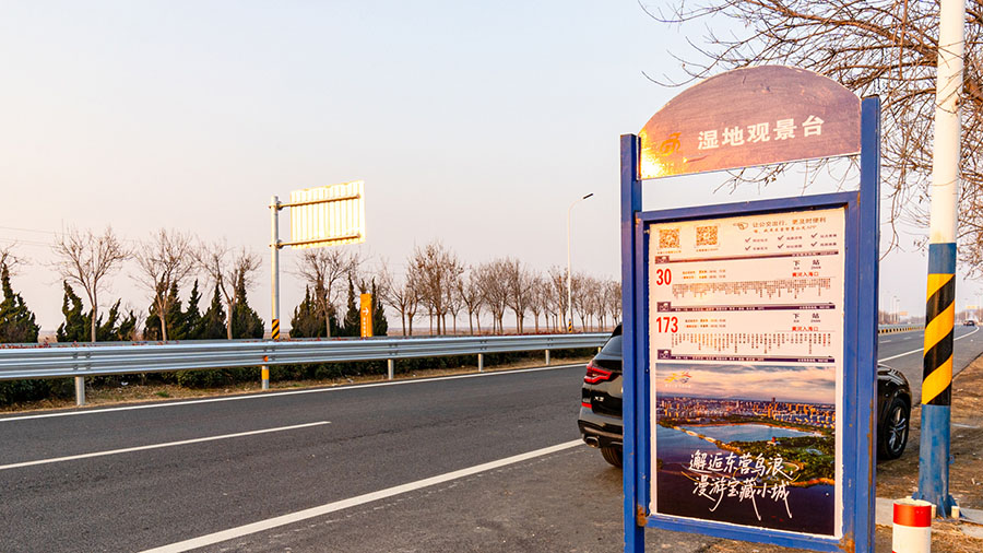車身化身為流動畫卷,“沿著黃河遇見海、漫游寶藏小城”的動人標(biāo)語與鳥浪翱翔、黃藍交匯、鶴棲濕地等特色景觀圖片交相輝映,在穿行街巷中展現(xiàn)著東營的生態(tài)之美。線路新增“荷塘濕地”“濕地觀景臺”兩處站點,精心設(shè)計的“站牌畫面”讓市民在短暫候車時刻也能領(lǐng)略到濕地城市風(fēng)貌。車廂內(nèi),車載TV循環(huán)播放文旅宣傳片,生動呈現(xiàn)濕地生態(tài)的四季之美。