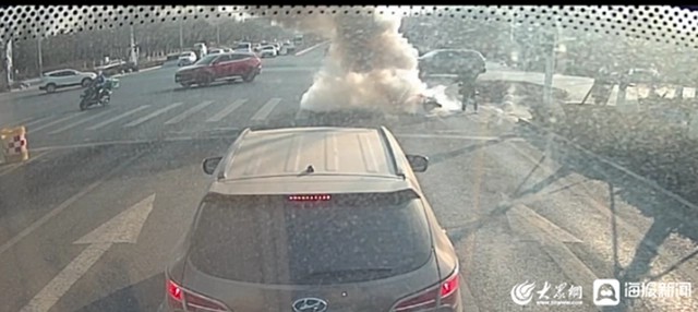 眼看火苗隨風越燒越旺,危急時刻,17路駕駛員張曉良駕駛著魯E97102公交車運行途經此處等紅燈,遠遠地看到前方冒著火光和滾滾濃煙的電動車,他拿起車載滅火器沖了過去,“當時路上的行人和車輛較多,情況十分的危急?!睆垥粤蓟貞浾f,他沒顧上仔細查看,把一瓶滅火器噴完,便抓緊回到車上繼續(xù)運行。