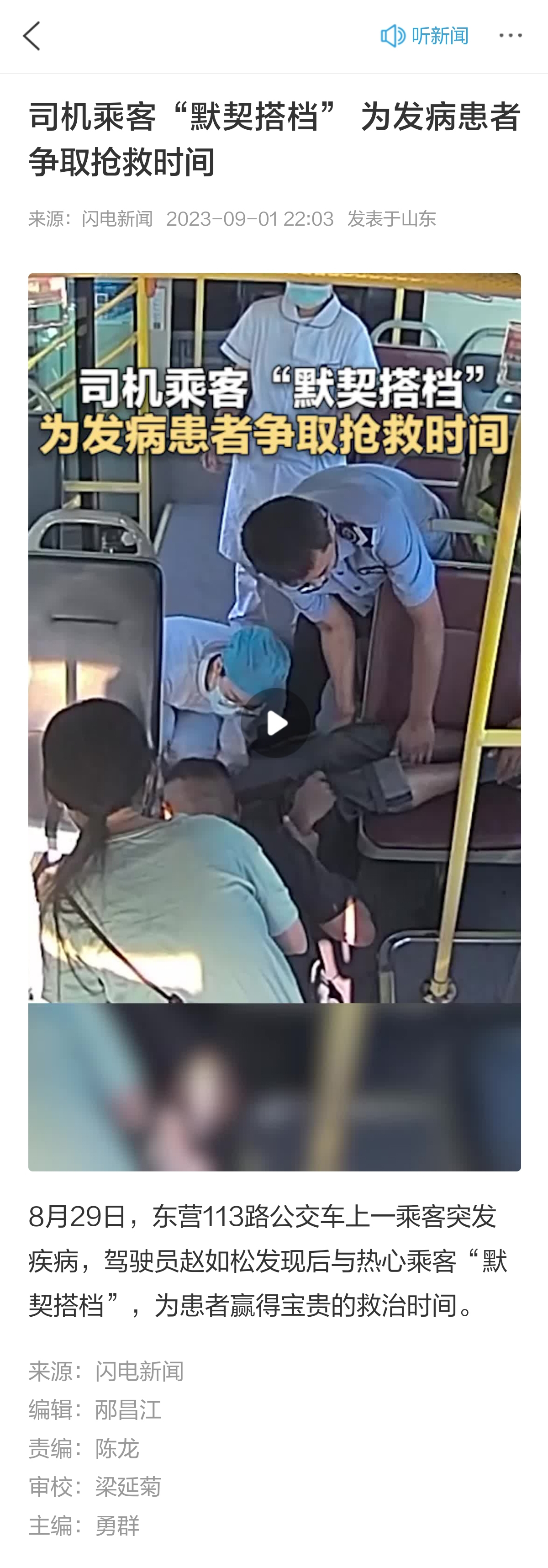 2023年8月29日下午4點58分左右,正在駕駛113路公交車的趙如松聽到了車內(nèi)乘客的呼救。他從車內(nèi)后視鏡看過去,發(fā)現(xiàn)車內(nèi)一男性乘客正在渾身抽搐,然后倒地不起,此時,坐在他后方的一名乘客見狀,立馬跑到駕駛員旁邊呼救。趙如松師傅馬上靠邊停車,并上前查看乘客情況,因接受過急救培訓,趙師傅立馬判斷,該乘客可能是突發(fā)疾病,在向公司匯報并征得車內(nèi)乘客同意后,立即將公交車開往醫(yī)院,為患者爭取急救時間。車輛到達到市人民醫(yī)院南門后,趙如松和急救人員合力將患者抬到急救擔架上,一起送到急救室,看著他情況穩(wěn)定后,才返回工作崗位駕車駛離。